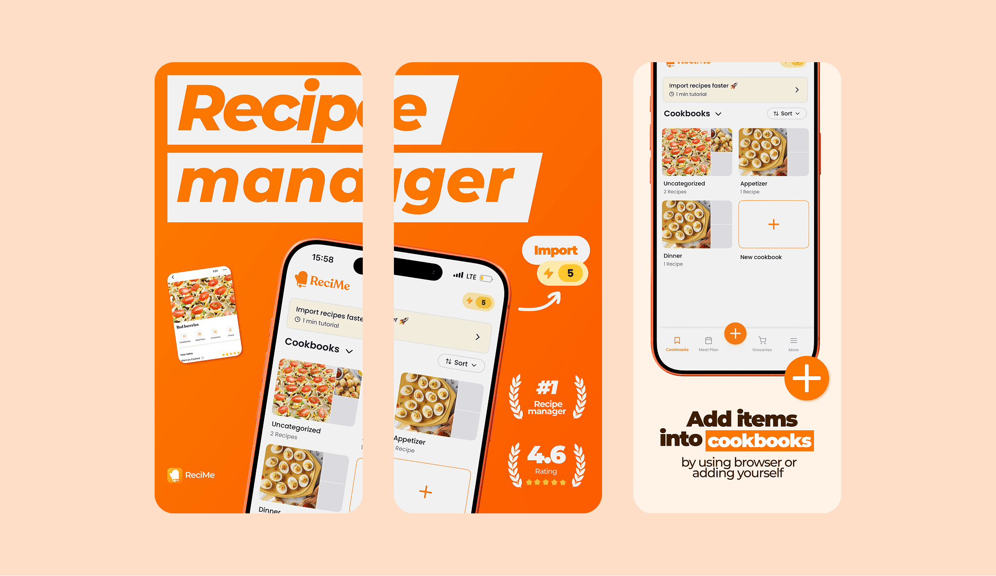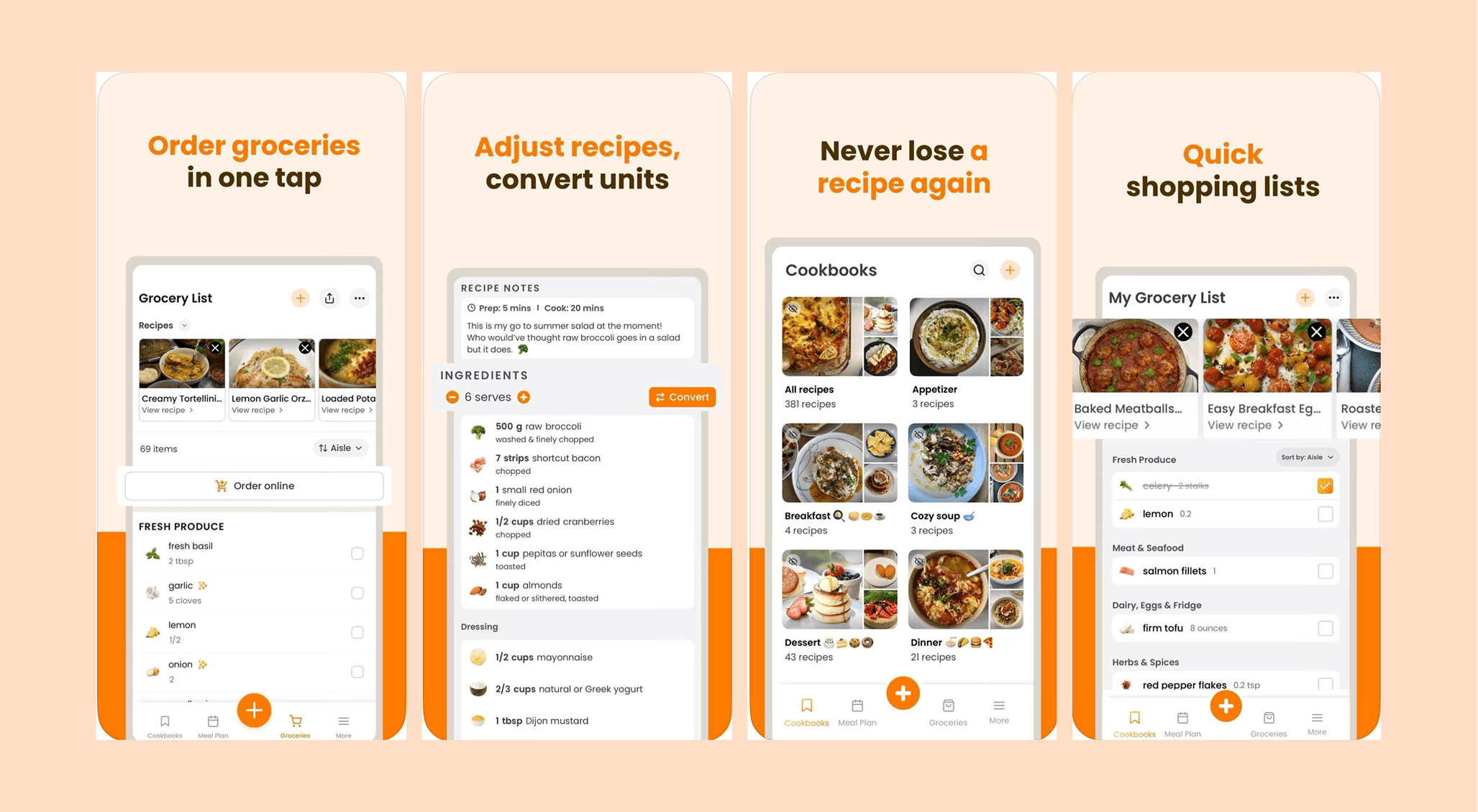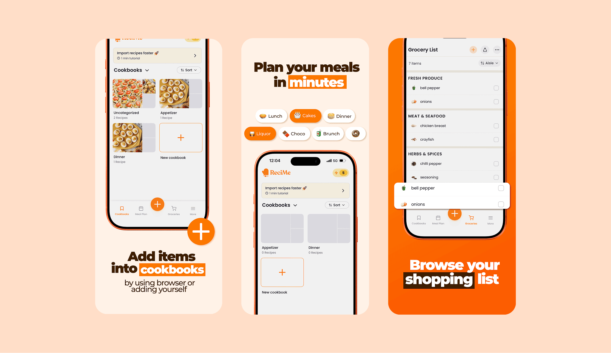 This screenshot set presents a recipe management app designed to help users organize recipes, plan meals, and manage grocery shopping in one place. The narrative highlights recipe importing, cookbook organization, quick meal planning, and integrated shopping lists.