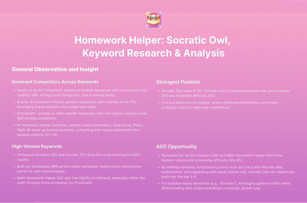 The strategy targeted high‑intent keywords in the AI homework solver and math helper category. Messaging emphasizes scanning homework, step‑by‑step explanations, and AI tutoring to balance discoverability with clear feature communication.