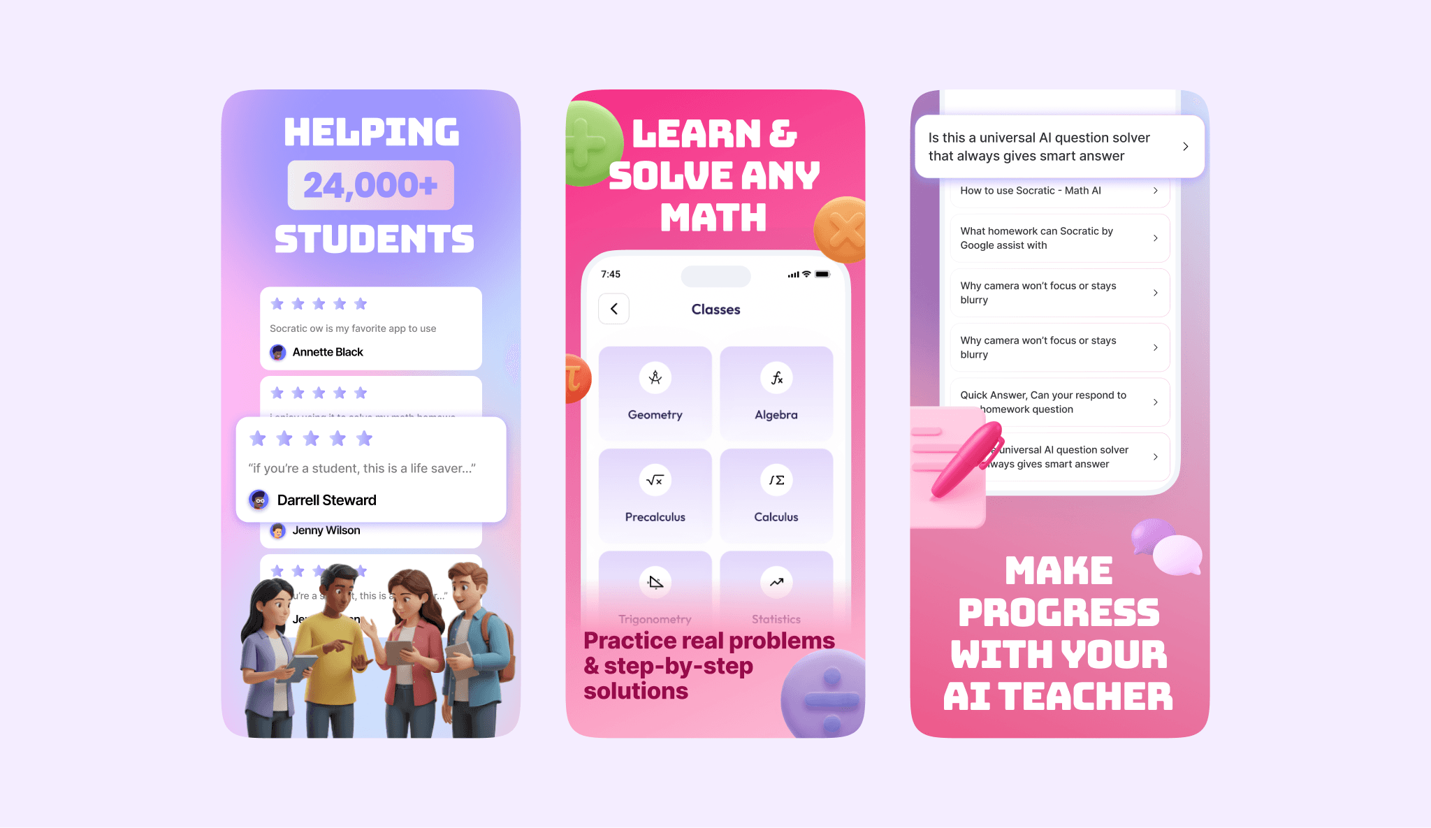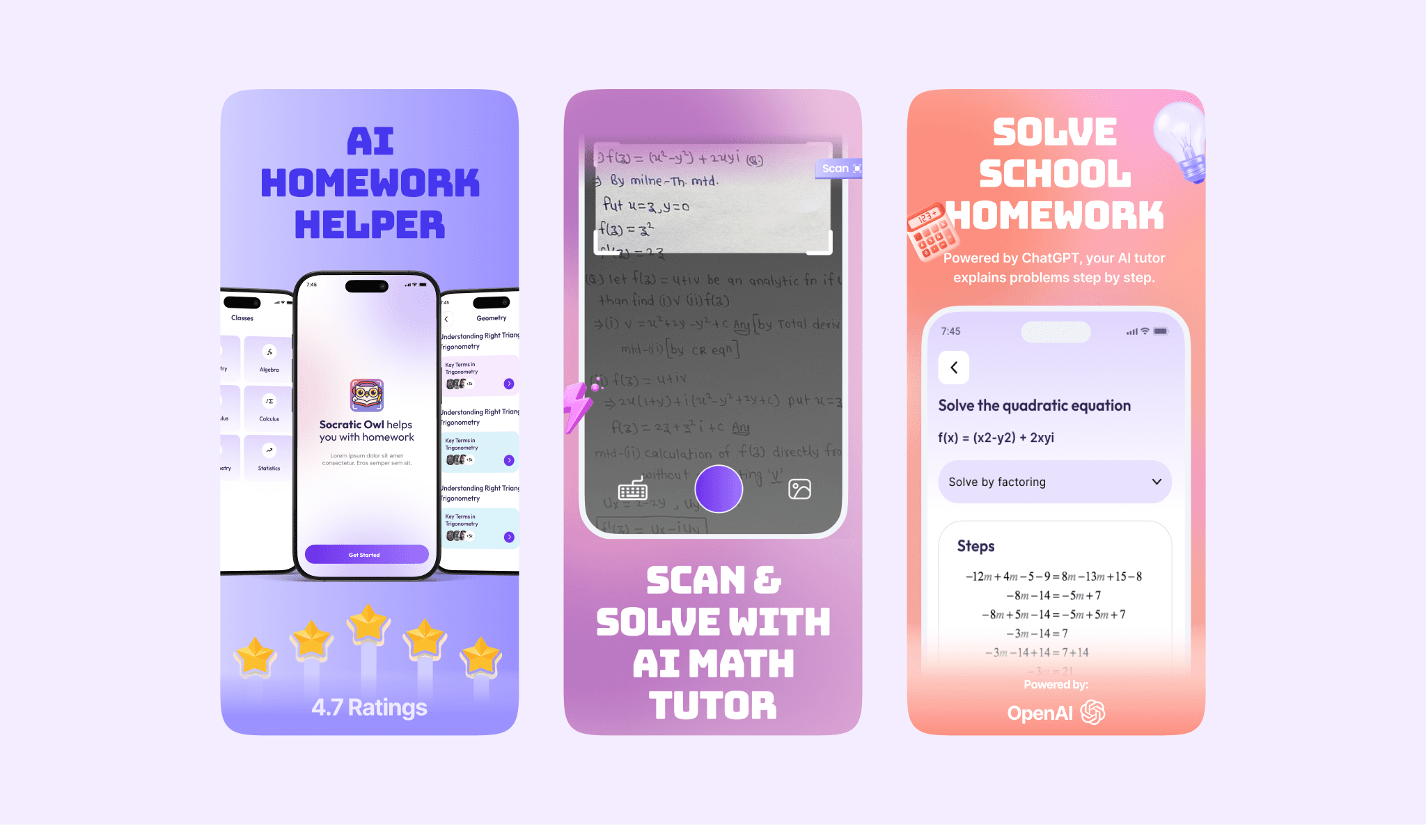 This screenshot set highlights an Socratic Owl, an AI-powered math homework assistant that helps students scan problems, receive step‑by‑step solutions, and practice multiple math subjects. The narrative focuses on speed, simplicity, and guided learning.